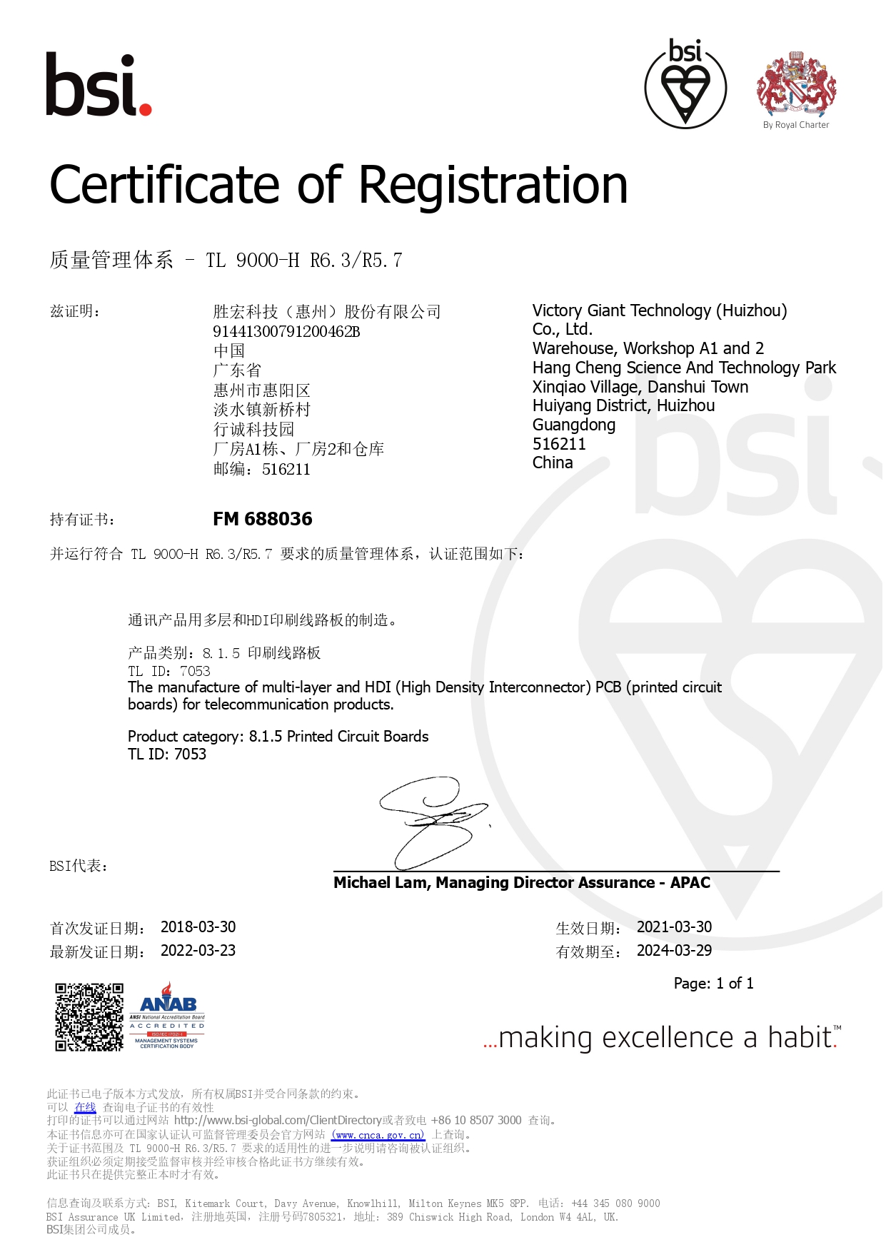 IATF169492016汽车行业质量管理体系证书
